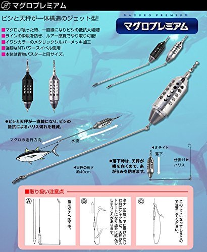 ビシカゴは80号から100号の青物向け、 大量にコマセが放出される タイプを選択します。 プラ製と金属製がありますが 放出量の制限が確実、 沈降速度に優れる金属製が人気。 天秤は固定式の他、 キハダに強い誘導式を選ぶ方も多いです。 クッションゴムは跳ね返って危険なので 天秤とハリスは直結で仕掛けを作りましょう。