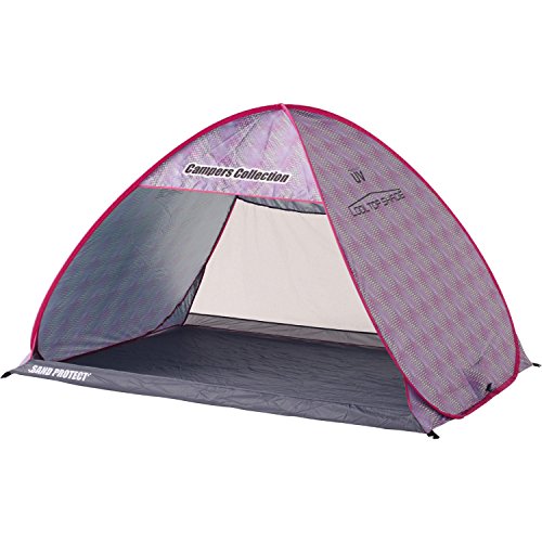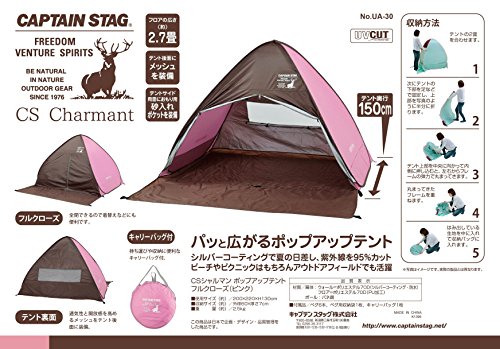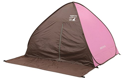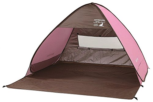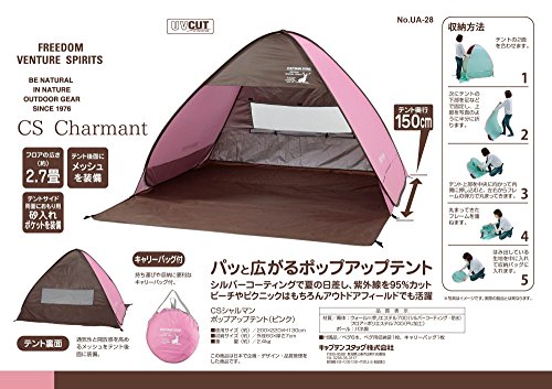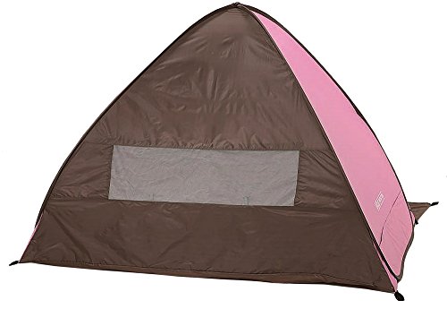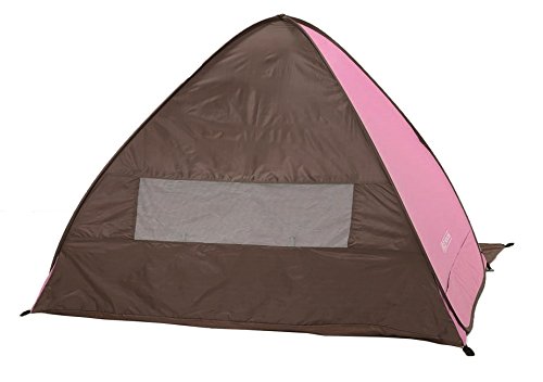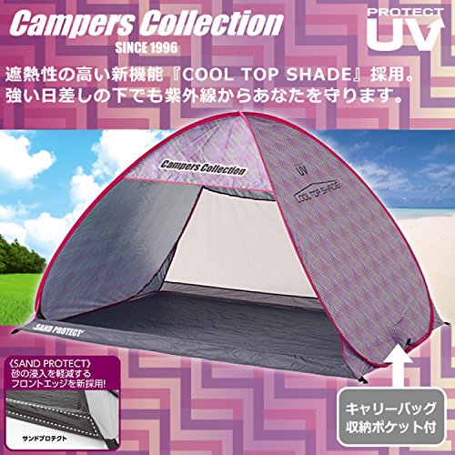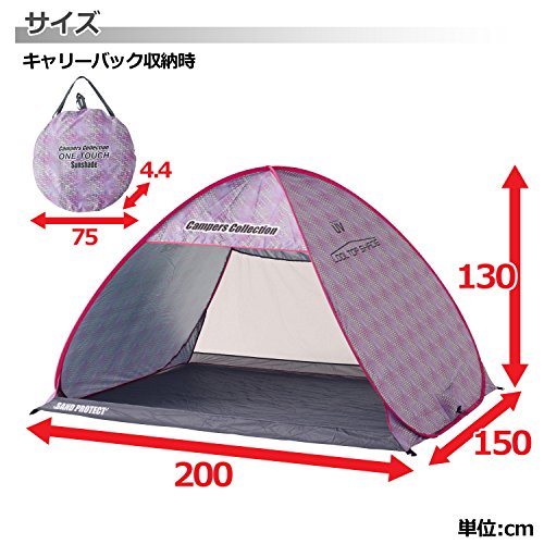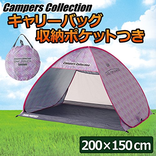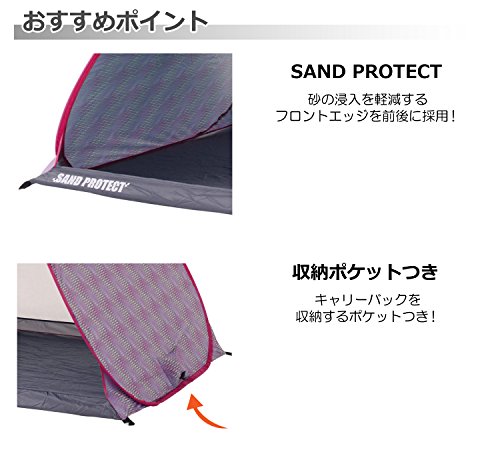 とてもシンプルな形のサンシェードタイプのポップアップテントです。背面のメッシュ窓が大きめなので風通しはいいです。左右のメッシュや前面に出るグランドシートなどの機能はありませんが、とてもお手ごろな値段なのでお得感はあります。 カラーはピンクの他にグリーンとブルーがあります。形がシンプルなので設営もしまい方も簡単です。UV加工はしてあるので、安心して海や公園で使用できます。
