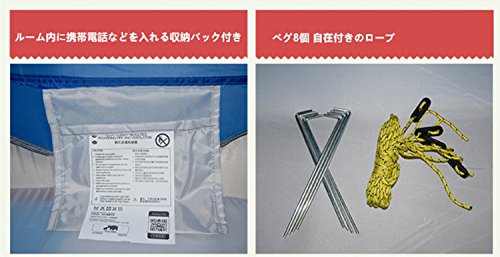 ROSYの一回り大きいタイプです。2~3人用と比較すると前後に長くなっています。シート部分に段差がないので足を伸ばして寝転がるのに向いています。前後が大きく開いて、左右にはメッシュの窓がついているので風通しは抜群です。内側にはポケットもついているので小物の収納ができます。もちろん、UV加工がされています。