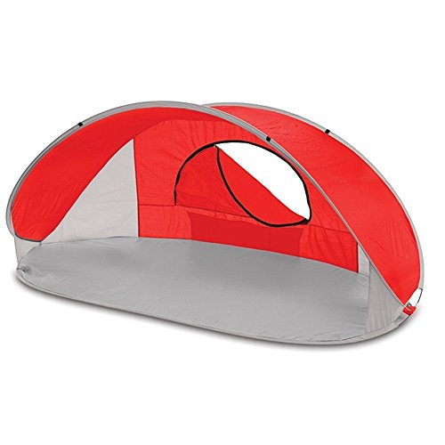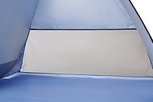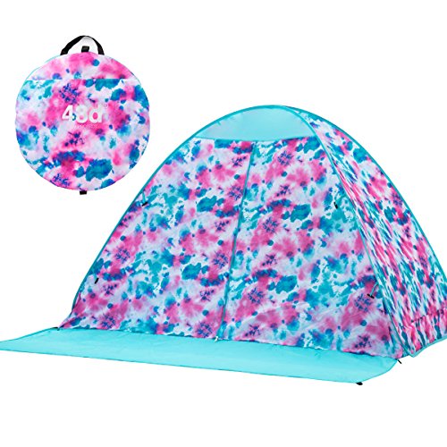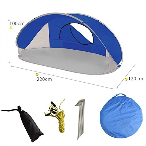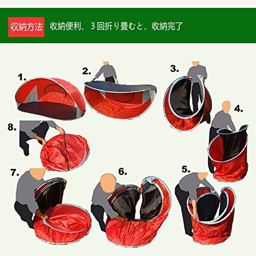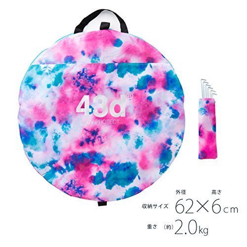 とてもカラフルで元気な色使いのサンシェードタイプのポップアップテントです。前面が大きく開いているので出入りがしやすいです。背面は全体的にメッシュになっているので風通しがよく快適です。内側にはポケットがついているので小物の収納に便利です。また砂袋が外側に縫い付けてあり、ペグも付属品で入っているので風対策は問題ありません。 高耐水加工とUV加工がされているのでビーチなどで使うのに向いています。