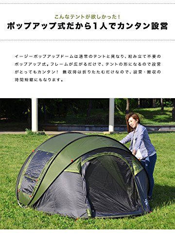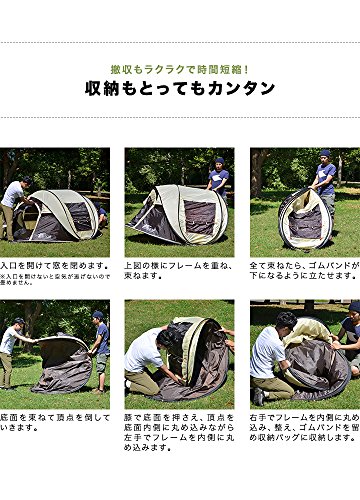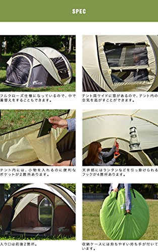 ドーム型のフルクローズタイプのポップアップテントで、公園やビーチというよりはキャンプに向いているテントです。。これだけの大きさでありながらわずかな時間で設営できつのは嬉しいですね。しまい方も動画で紹介されているので簡単にできます。左右には上下に分かれたメッシュ窓がついているので換気も十分にできます。内側には、小物を入れられるポケットやランタンなどがかけられるフックもついているので快適に過ごせます。 また、前後ともに開くので出入りがどちらからもできます。大人4人で使用できますし、これだけの機能が揃っているのでキャンプでも十分に使えます。カラーはカーキ×ダークグレー、ベージュ×ブラウン、ライム×グレーの3色で、どれも落ち着いた色合いでとてもおしゃれです。