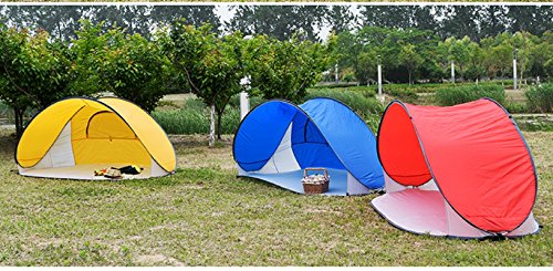 横幅が広い形のサンシェードタイプのポップアップテントです。横幅が広いので数人が横に並んで座ることができ、足が濡れたり汚れたりしている場合でも安心です。天井が高いので開放感があり、風通しがいいです。UV加工がされていて、内側にはポケット、背面には開閉できるメッシュの窓がついています。付属品でペグとロープが入っているので、風があるときにはすぐに対応できます。 イエローのカラーがおしゃれで目を引きますね。カラーは他にブルーとレッドがあります。