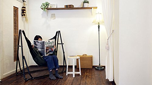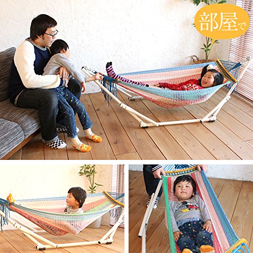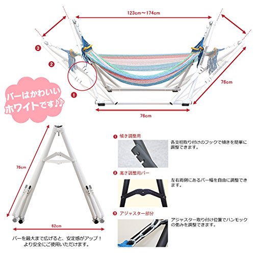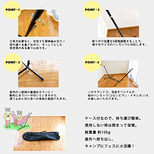 傾きとネットの張り具合を調節できるタイプの自立式ハンモックです。 設置する際に指を挟まないように配慮して 作られているため安心して使えます。 ハンモックを室内で使うときに床を傷つけないように スタンドの下にゴムパッドがついているところもおすすめです。 少し重たいという声もあるみたいですが 少し重たいくらいが安定感があっていいと思います。 カラーもたくさんあるため 室内では、この色のハンモックを使い キャンプなどのアウトドアはこの色のハンモック なんて使い方もできて嬉しいですね。