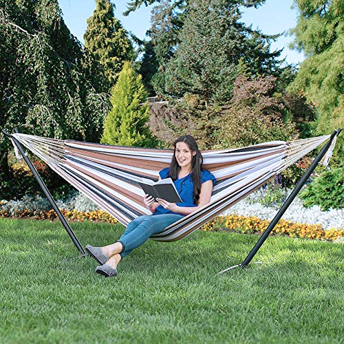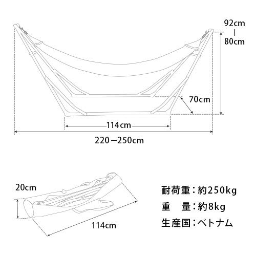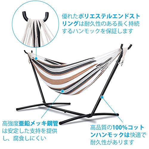 100kgの大人が2人、乗ることができるダブルサイズのハンモックです。 自立式のハンモックのため、 また、コットン100%で、できているため肌触りもよく、 工具不要なので組み立てや取り外しなど設置が簡単にできます。 とても安定していて寝心地がよく気持ちがいいですよ!! 仲のいい、お友達と2人でハンモックに乗って おしゃべりをしたりする時にもおすすめです。 また、カップルが2人でお昼寝で寝る時などにも 使用してもいいかもしれませんね。