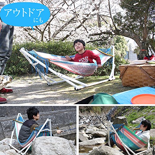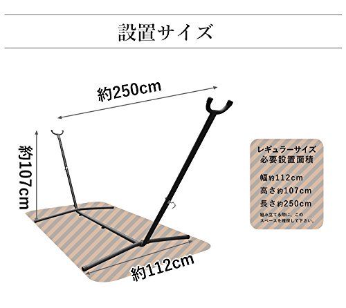 アルミニウム製のスタンドを採用し、スタンド付きハンモックでは 超軽量の約6Kgです。 スタンドは広げて4箇所のピンを通すだけで 簡単に設置することができます。 室内で使用する人が多いみたいです。 室内で使用したい人は 少し大きいため寸法を測ってから 購入するのをおすすめします。 大きさはシングルベッドくらいです。 室内で設置し、ベッド代わりに使うなんて 人もいるみたいです!! 寝心地は最高でメッシュ構造なので暑くなる夏にはおすすめです。