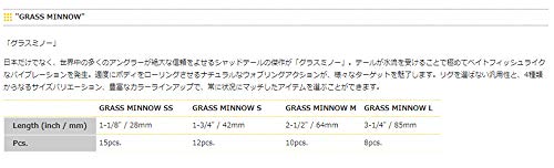 もっとも小さいサイズとなる グラスミノーSSは1.1インチの28mm。 15本入りで定価550円と手軽な価格も魅力です。 一口サイズなので釣れる魚のサイズは選べませんが メバルやメッキなど様々な港の小魚が狙えます。
