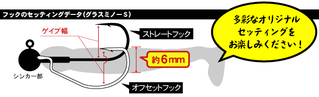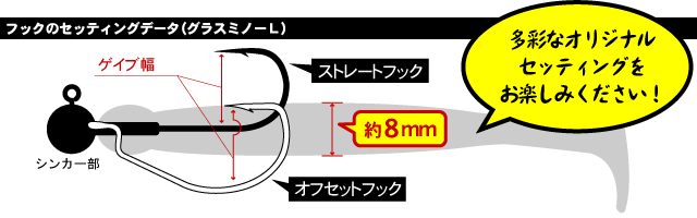 真っ直ぐフックをセットする事で 安定したスイムアクション、 規則正しいテールアクションが生まれます。 刺しにくい場合はヘッドをカットしても かまわないのでなるべく中央に刺さるように フックをセットしてください。 大型のワーム、フックを使用する場合は 事前に爪楊枝で穴を開けておくと スムーズにフックがセット出来ます。