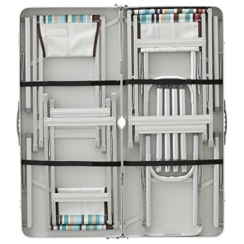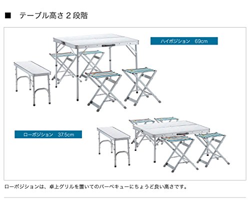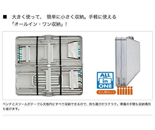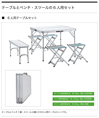 ■選び方 6人用なので、家族で使用するオールインワンのテーブルセットとして 人気の商品です。 テーブルの他にベンチ一つと、スツールが4つ付いています。 テーブルの真ん中にはパラソルホールが付いているので、パラソルを装着して 使うこともできます。 テーブルは二段階調節が可能で、ローテーブルとしても使用できます。 ローテーブルにして、ベンチを組み合わせて使用すれば、テーブルが広く 使用できるようになります。 たくさんの椅子がありますが、全てがテーブルの中に収納できるオールインワン なので、持ち運びにとても便利でおすすめです。 ■商品概要 総重量:(約)11.3kg テーブルサイズ:(約)幅93×奥行82×高さ69/37.5cm ベンチサイズ:(約)幅87×奥行25×高さ40cm スツールLサイズ:(約)幅39×奥行34.5×高さ41cm スツールMサイズ:(約)幅39×奥行30×高さ41cm 収納サイズ:(約)幅94.5×奥行43×高さ10.5cm 素材:[フレーム]主素材アルミ [テーブル天板]プリント紙化粧合板+ウレタン樹脂コーティング [生地]ポリエステル