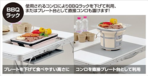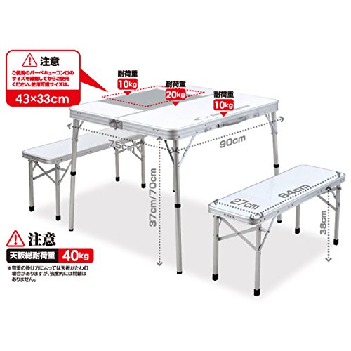 ■選び方 4人用のオールインワンタイプのテーブルセット。 バーベキューラック付きで、テーブルにバーベキューコンロを設置することができます。 オールインワンでバーベキューコンロが置けるテーブルセットとは嬉しいポイントですよね。 天板は、約150℃の耐熱、耐滴加工のハイコートデスクトップになっています。 テーブルでバーベキューを楽しむことができるので、食材をテーブルに置いたり、 焼き上がったものをそのままテーブルに置くことができるのでとても楽でおすすめです。 2WAYタイプで、シーンに合わせてローテーブルにすることもできます。 持ち運びに便利な折りたたみ式テーブルセット。 選び方として、テーブルの上でバーベキューしたい方におすすめの商品です。 ■商品概要 テーブルサイズ:幅90×奥行75×高さ37/70cm ベンチサイズ:幅84×奥行27×高さ38cm 重量:9kg 材質:天板=合成樹脂化粧繊維板(ポリエステル樹脂)、フレーム=アルミニウム、BBQプレート=スチール バーベキュー部:幅46×奥行33cm 天板耐荷重:40kg