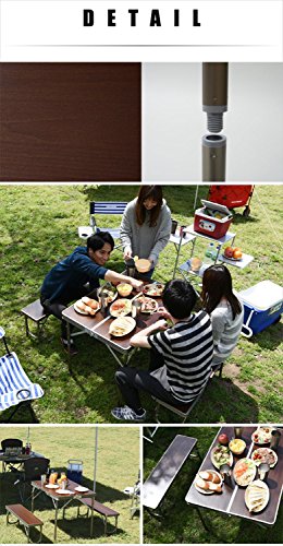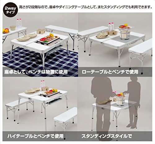 ■選び方 4人用オールインワンのバーベキューにぴったりなテーブルセットです。 テーブルは、高さが二段階で調節できます。 ハイテーブルにもローテーブルにも変えられるので、 その時の状況に合わせて使うことができます。 大人が使う場合、お子様が使う場合で高さを変えてもいいですね。 アルミ製なので、持ち運びにも便利です。 ■商品概要 サイズ:テーブル/幅900×奥行620×高さ700・380mm、ベンチ/幅860×奥行240×高さ380mm、座面の高さ/380mm、収納サイズ/幅900×奥行100×高さ320mm セット重量:(約)8.5kg 材質:テーブル甲板・ベンチ張り材/合成樹脂化粧箱合板、構造部材=アルミニウム(表面加工アルマイト) 耐荷重:(約)テーブル/30kg(均等)、ベンチ/140kg(片側70kg)