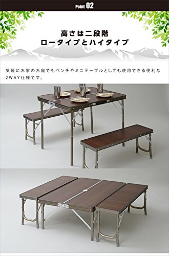 ■選び方 2人用のコンパクトなオールインワンのテーブルセットです。 夫婦やカップルにおすすめのテーブルセット。 コンパクトなので、キャンプで使用しない時はバルコニー等 でも使用することができます。 自然にピッタリな、木目柄の落ち着いた雰囲気の良いカラーです。 高さが二段階調節でき、ローテーブルとしても使用できます。 オールインワンタイプでキャリーバッグ付きなので、肩にかけて 簡単に持ち運ぶことができます。 ■商品概要 サイズ:テーブル=幅81×奥行40×高さ35.5/60cm 重量2.7kg、チェア=幅31×奥行35×高さ35.5cm 重量1kg 収納時:幅45 奥行14.5 高さ52cm 材質:テーブル天板=アルミ(エポキシ樹脂塗装)、フレーム=アルミ