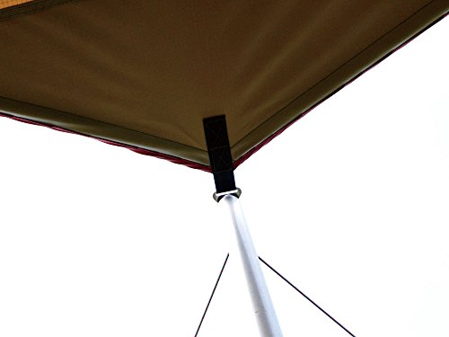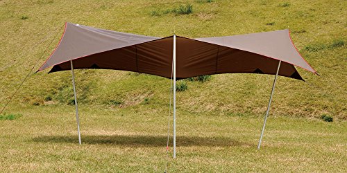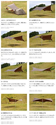 綺麗なアイボリーカラーで シェルターやテントと組み合わせた張り方がおすすめのタープになります。 設営には 最低2本のウイングポールが必要で、280cmの長さのものが推奨されています。