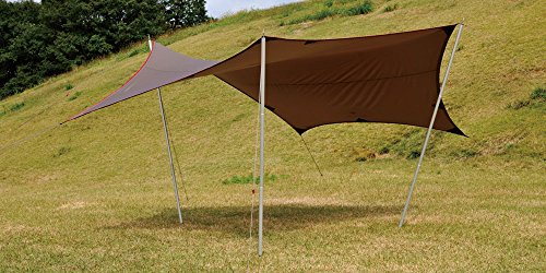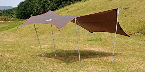 3枚の210Dポリエステルオックスを 両面からバイアステープでサンドイッチした5重構造になっていて、強いテンションがかかった張り方をしても大丈夫な耐久性を持ったおすすめのタープになっています。