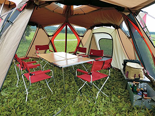 コーナーの間にグロメットが付いているので それぞれの状況に応じていろいろな張り方選びが可能になるので、おすすめのヘキサタープですね。 設営には 最低2本のウイングポールが必要で、210cmのウイングポールが推奨されています。 さらに 180cmのポールを2本プラスすることにより、広々とした開放的な空間を作る張り方ができます。 ランドブリーズ2テントとの組み合わせた張り方がおすすめで エルフィールド ヘキサ Pro.サイドのアールを組み合わせた張り方によって、テントの前に快適なリビングスペースを作ることができるのです。