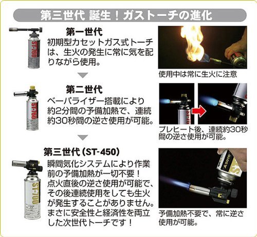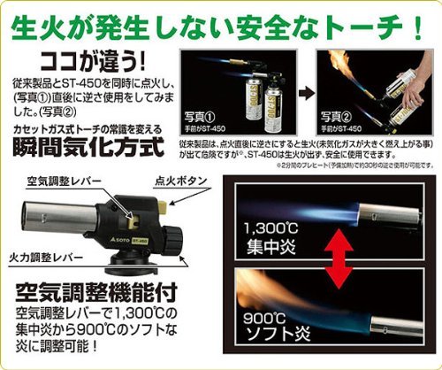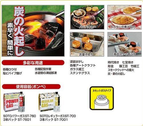 カセットガス式にもかかわらず点火直後に 逆さにして使用しても生火が出ない ガスバーナーです。 また、カセットガス式トーチの常識を変える 「瞬間気化方式」となっています。 そのため、点火後すぐに炎が安定し 初心者さんや女性にもおすすめのアウトドアグッズとなっています。 空気調整機能付きで1300度の強力集中炎から 900度のソフトな炎まで用途に応じて調節可能なため 便利なガスバーナーとなっています。 そのため、炙り料理から炭の火おこしまで 様々な使用方法があり火おこしには必要なグッズですね。