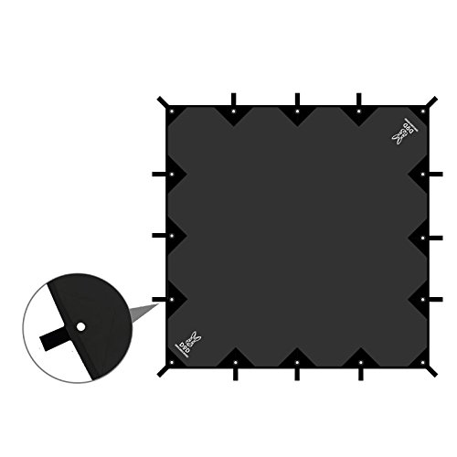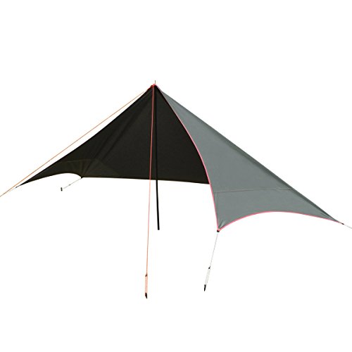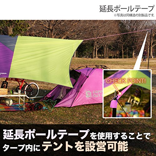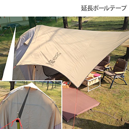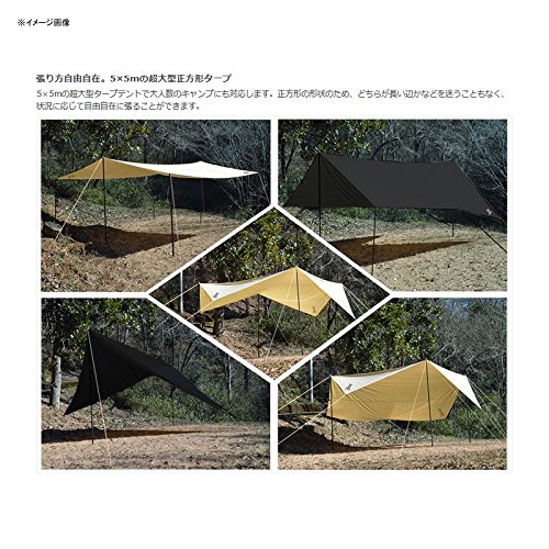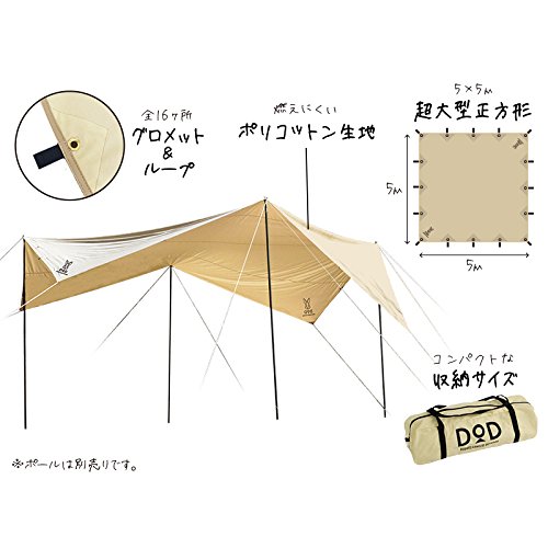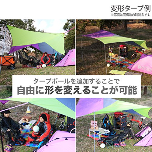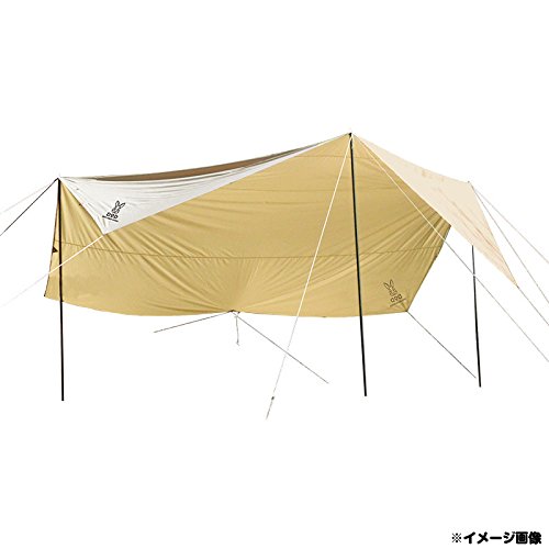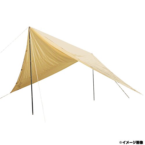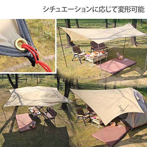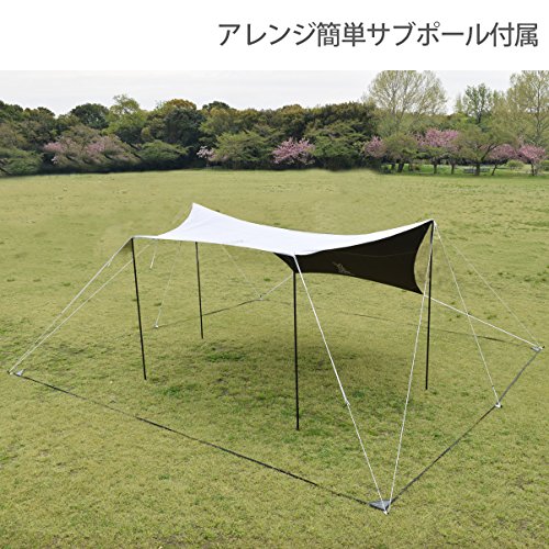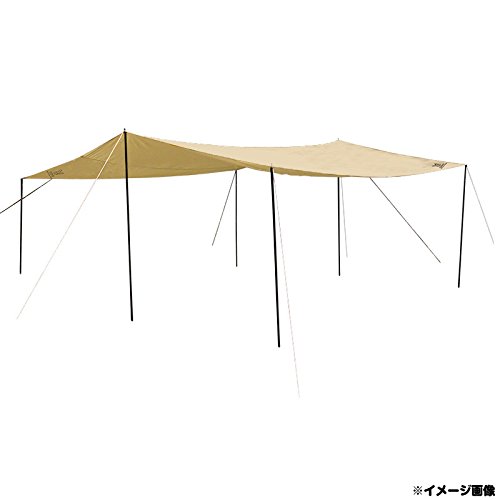 超大型タープで 大きさは5m×5mもある正方形のタープで、しかも設営スタイルは状況に応じて、いろいろな形に変えられるので使い方も自由度が増してナチュラルに楽しく遊べるおすすめのタープですね。 大型のカマボコテントなどと一緒に使えば さらにリビングスペースが広くなり、寝室と快適で大きなリビングスペースができあがり、キャンプ生活を大いに満喫できますよね。 そして 素材がポリコットンなので、火の粉にも強いとあって、夜には焚き火なども安心してできますね。 注意が一つあります このタープにはポールがセットになっていないので、タープ購入時にポールも一緒に購入しないとだめですよ。