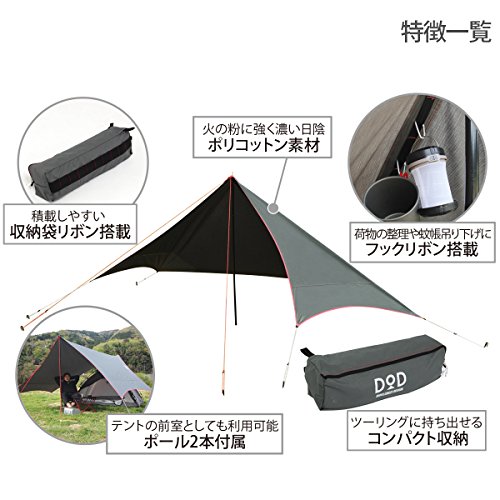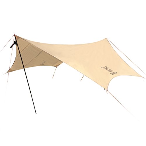 ポリコットン素材は ポリエステルとコットンの混紡生地素材で、これは火の粉にも強いので焚き火を楽しむことだってできるのです。 さらに 濃い日陰を作ってくれるタープでもあるので、最高の昼寝の場所を作り出してくれるのがさすらいタープなのです。 ソロキャンプにはおすすめのタープで 中央部にはランタンや蚊帳が吊り下げられるようになっています。 またテントと併用させれば 広くてさらに直射日光をさえぎってくれて、ナチュラルな光が入る前室としても使うことができるのです。 張り方も ポール1本での設営や、ポールを2本使った設営などができるので、タープ張りのバリエーションも選ぶことができて楽しいタープですね。