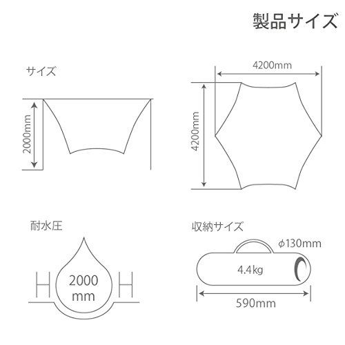 設営サイズ:(約)W4200×D4200×H2000mm 収納サイズ:(約)直径130×長さ590mm 重量:(約)4.4kg