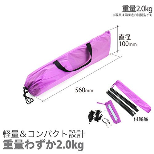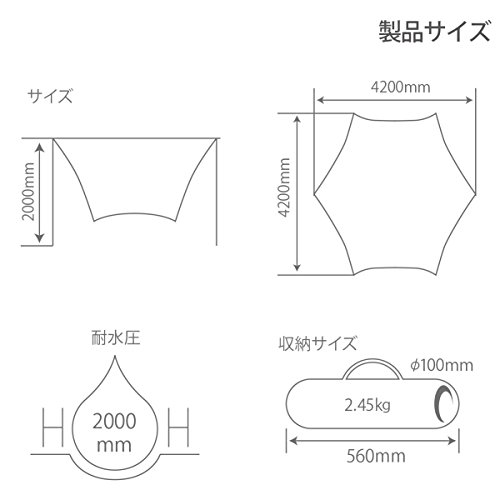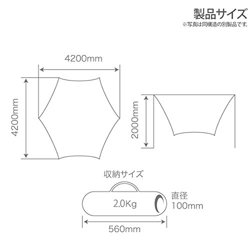 設営サイズ:(約)W4200×D4200×H2000mm 収納サイズ:(約)直径100×長さ560mm 重量:(約)3.4kg
