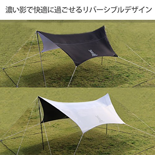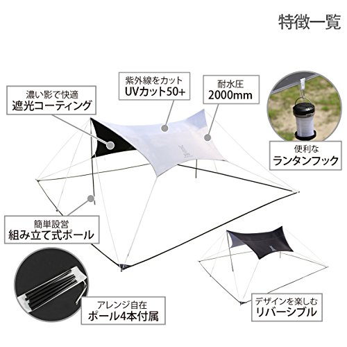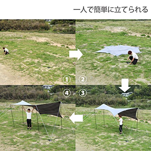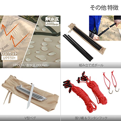 初めてのタープ購入者です。 この他のタープをまだ拝見したことがないですが、1人で組み立てが出来ることがいいなと思ったので購入しました。組み立ての説明がもう少し記載されていたらいいなと思いましたが、完成したら記載されていなくても大丈夫でした。 どのくらいの使用が出来るのか不安ですが、 カッコよくて使い勝手は良いと思います