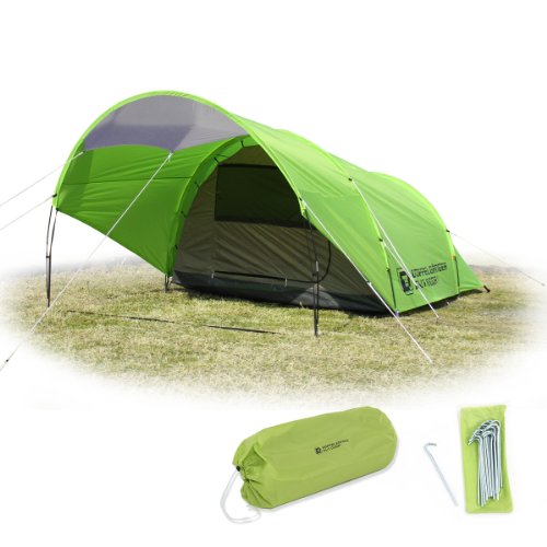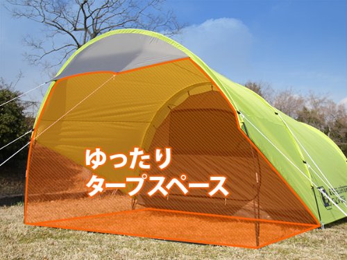 タープとテントが一体化され 広い前室のタープスペースが付いているテントで、ユニークでおすすめのタープリーテントです。 しかも 構造がフレーム3本だけのシンプルなので、張り方も生地に3本のフレームのスリープに入れて、ペグで打つだけのトンネル構造になっていて、収納もコンパクトになっているのがタープリーテントなのです。 さらに インナーテントはアウターテントに吊り下げるタイプになっていて、バックルを取り付けていればアウターテントと同時に設営することができて簡単に設営できるタープリーテントです。 このタープリーテントは インナーテントを外せば、ナチュラルなシェルターとして使うことができるので、食事のスペースや自転車やバイクの保管場所にもなりますね。