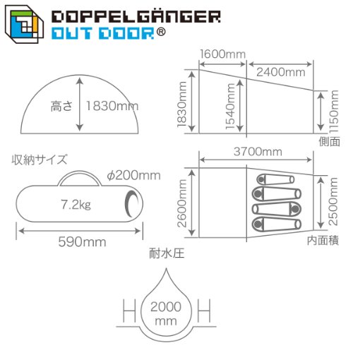 設営サイズ:(約)W2600 × D4000 × H1830mm 収納サイズ:(約)590×直径200mm 重量:(約)7.2kg