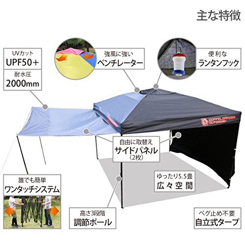 大型のタープで 広さが5.3m×4.2mになっているので、ファミリーのアウトドアでもしっかりと日陰を確保してくれナチュラル光を入れてくれるのでゆったりできるタープですね。 プレミアムワンタッチテントとの併設では タープをジッパーで連結することができるので、プレミアムワンタッチテント前に大きなリビングスペースを確保することのできるタープです。 しかも 防炎加工になっているので、キャンプでの使用も安心でおすすめですね。