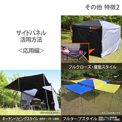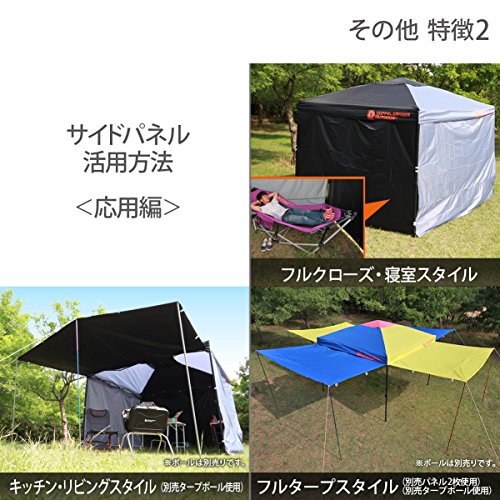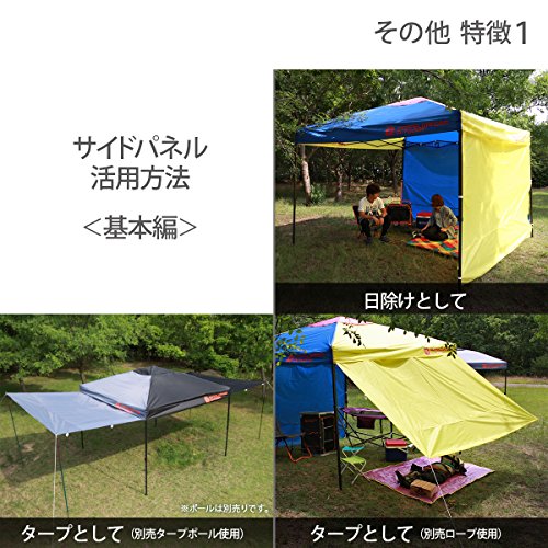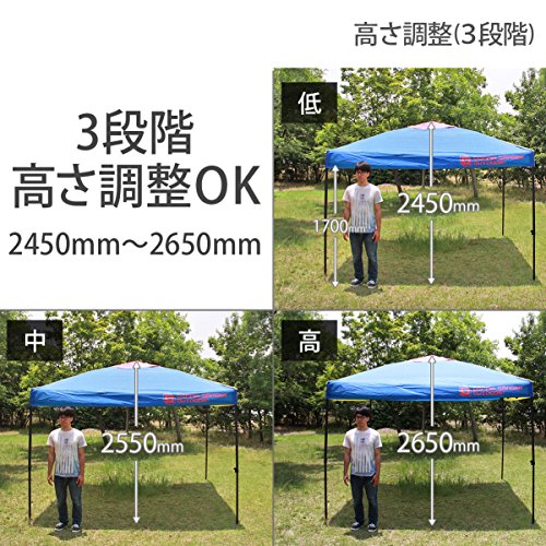 大型ワンタッチタープで 3m×3mのスペースが確保でき、さらに別売りのサイドパネル2枚を足すことによって4面を囲うことができ、それらの全てのサイドパネルを跳ね上げることにより、なんと約20畳の日陰スペースを作りナチュラルな光の入るタープなのです。 高さも 3段階で簡単に調整が出来て2450mm、2550mm、2650mmの高さになるので、その時のシチュエーションに応じて変えることができ便利ですね。