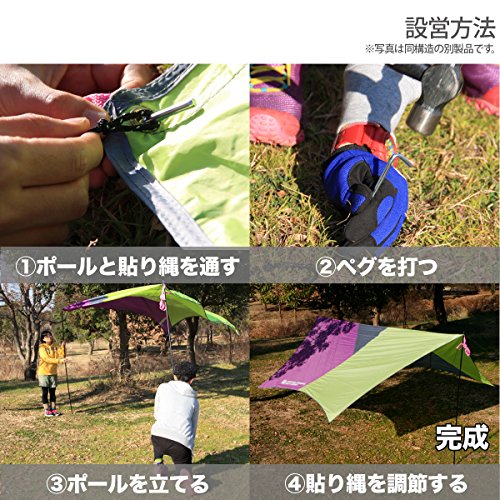 1.タープを広げ、ポールの先端をタープの鳩目に差し込みます。 2.鳩目に付いているループにロープを結び、ペグを打ちこみます。 3.ポールを立てて、各ロープの長さを調節して、ポールを固定します。 4.タープの4隅の鳩目にポールの先端を差し込み、2.3.の要領でポールを固定して完了です。