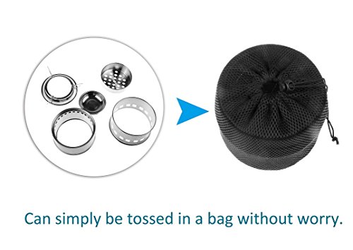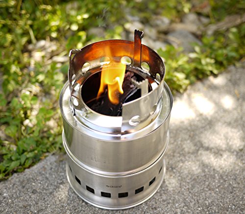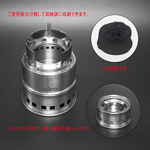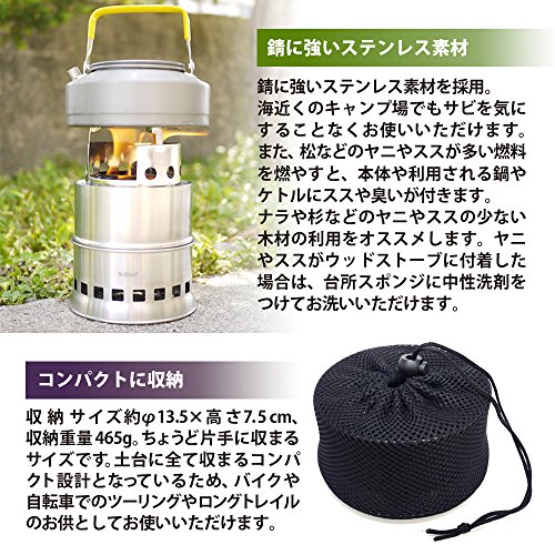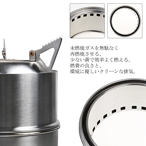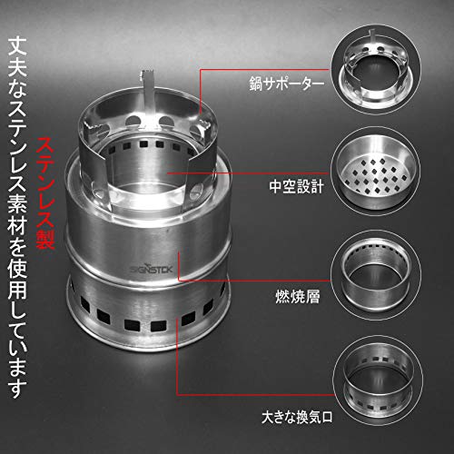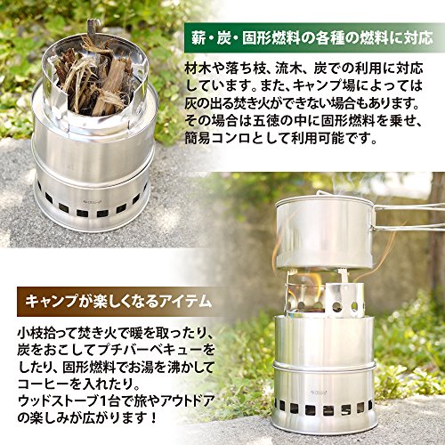 このストーブは硬化ステンレス鋼で作られているので、 丈夫で壊れにくいためキャンプやバックパッキングなどに最適な円柱型のストーブです。 使い方も簡単で燃焼室を二段重ねて、 三段目に灰皿を置いてその上に五徳を置くだけで簡単にできあがります。 重量も380gと軽量になっていて持ち運ぶのも楽だし、 燃料は薪やチップなどの自然の素材が使えるストーブです。 持ち運びはコンパクトで軽量さらにメッシュバッグが付いているので キャンプや登山にも重量を気にしないで気軽に持って行くことができますね。 ちなみに固形燃料を使うこともできる仕様になっているので、 さらに手軽に食事の準備などをすることもできますね。
