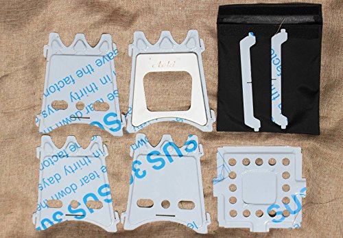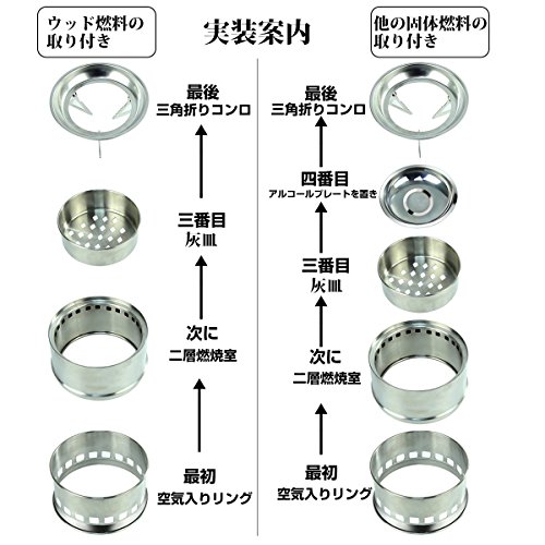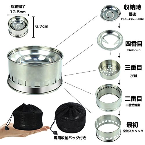 【組み立てサイズ】14cm×14cm×8cm 【重量】465g 【材料】ステンレ 【内容】五徳 (上台)、中台、土台、燃料トレー (薪受け)、固形燃料皿、収納袋 (メッシュ素材)