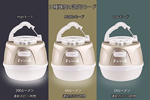 このLEDランタンは、明るさが最大200ルーメンです。 lowモード・middleモード・highモード・stereoモード・SOSモードの5種類から選べます。 highモードでは、連続点灯で11時間、middleモードでは、連続点灯で36時間、lowモードで連続点灯で110時間使うことができます。