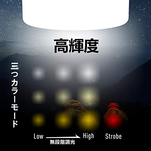 このLEDランタンは、明るさが次の5種類から選べます。 lowモード・middleモード・highモード・stereoモード・SOSモードの5つがあります。 highモードは196ルーメンで連続点灯が約1日間できます。 middleモードは64ルーメンで連続点灯が約3日間できます。 lowモードは24ルーメンで連続点灯が約7.5日間できます。 このLEDランタン1台で12畳の部屋がしっかり明るくなるので1台持っておきたい人にはおすすめとなっています。