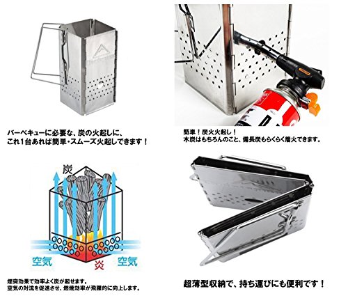 ●折り畳み可能でコンパクトな火おこし器。●煙突効果で効率よく炭に火をつけられます。●火を熾している間に、テーブルなどの設営、材料の下ごしらえ等が出来る!●専用ケースつきで持ち運びも便利。●素材はステンレスだから、丈夫で耐久性抜群!●丈夫なハンドルつきで、炭の出し入れも簡単!