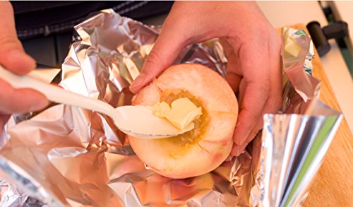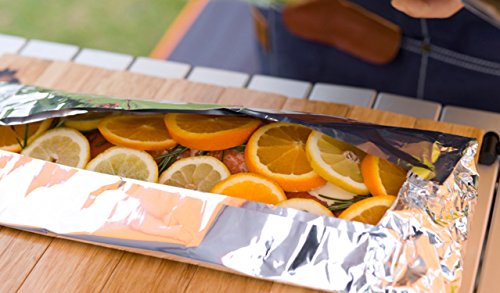 極厚のアルミホイルで大きさも普通のアルミホイルの1.5倍くらいはあるでしょうか、とても厚みがあり、少々の火力ではビクともしません。これをBBQ台の下部に敷いておくだけでお掃除は格段に楽になります。 また別の使い方として、BBQ終了後に網の上にかぶせて、余った炭でカラ焼きをすれば、網についた油汚れがかなり落ち、最後にバーナーで網全体をあぶり焼ききれば、帰ってからのお手入れが格段に楽になります。 これと同じシリーズで焼きそば用の極厚アルミホイルも発売されています。