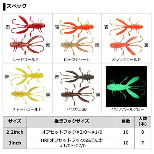 甲殻類を模したタイプのワームです。リフト&フォールではクローを揺らしながら落下、ステイでもクローでアピールします。アベレージが小さい釣り場や、他のロックフィッシュと合わせて狙いたい場合におすすめのタイプです。