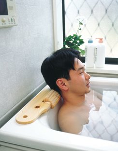 浴槽の縁にセットして枕のように使う檜のお風呂枕は本当におすすめです。 首のつけねをマッサージしてくれるお風呂枕は、檜の香りでリラックスできる商品です。