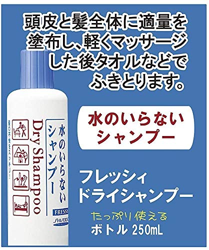 こちらは資生堂から販売されているフレッシィ ドライシャンプー ボトルタイプ 250mlです。値段も300円代とお求やすく、清涼感を感じられると好評化も多いです。使用する際は、効果的に使用するために多めにスプレーして、良く揉みこむのをおすすめします。フレッシィ ドライシャンプーの使用の動画を紹介しますので参考にしてくださいね。
