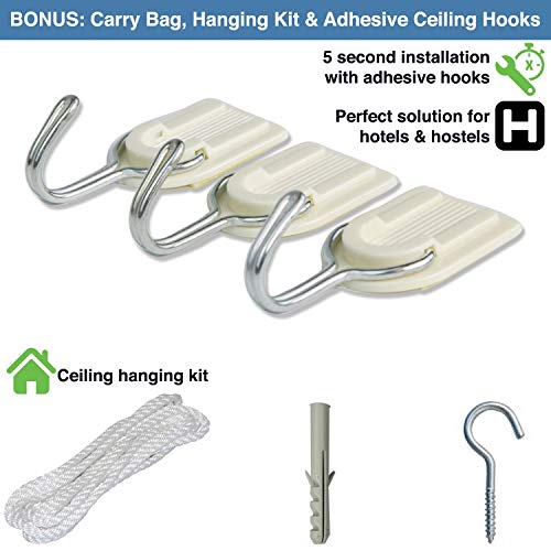 ユニバーサル バックパッカーズが販売する蚊帳は、吊り下げ式で簡単に使えるのが特徴です。本来は旅行での宿泊など室内用に作られていますが、タープ泊ではランタンハンガーへ吊るして設置してみてください。