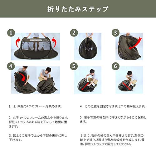 Dimples Excelが販売するポップアップ式の蚊帳もお手軽でおすすめします。1kg以下の重量なのに、メッシュと地面からの浸水を防ぐ防水シートが付属。コットにも固定しやすいサイズ感が評判です。