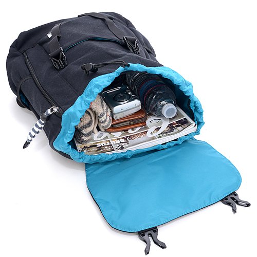 メイン収納スペースのフタを開くと、巾着のように絞れる作りになっているので、大きな荷物でも楽に出し入れできるので安心です。 上部のふたの部分にもジップ付の収納スペースが付いていて、サイドには内側にアクセスできるジッパーポケットも付いているので、上部のふたを開閉しなくても内部の荷物の取出しができるのでとても便利な機能になっています。