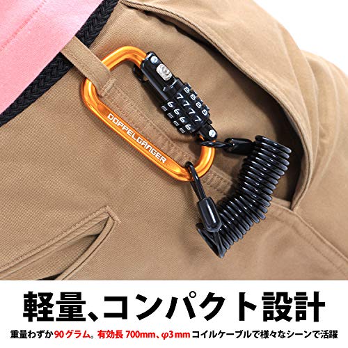 DOPPELGANGER から販売されているロックシステムです。こち他の商品の特徴は「カラビナ型ロック」になっている所です。しっかり固定できると共にケーブルは伸び縮みする1500mmが採用され長さが十分にありながら収納時はコンパクトに収納できる点がおすすめで持ち運びが簡単です。