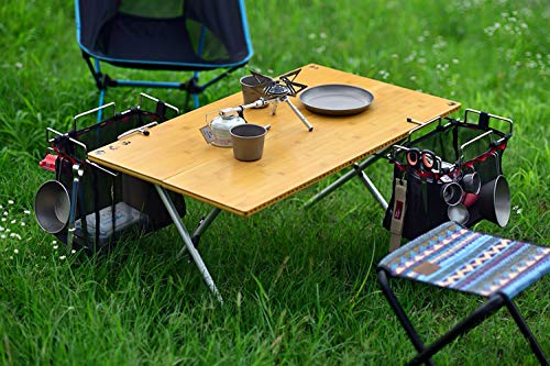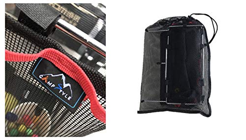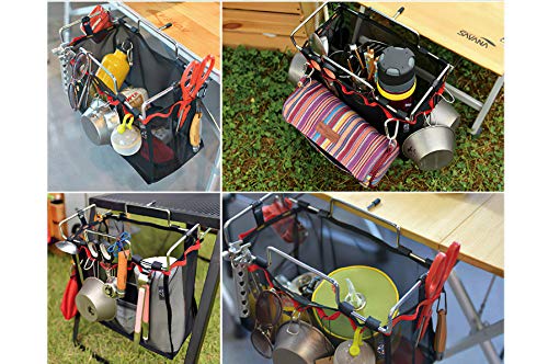 そんな時に便利なのが、このcampstyleのメッシュバッグ付きテーブルサイドラックです。 洗った食器やカトラリーをそのまま入れておけば邪魔にもならず、厚さ10~30mmのテーブルに装着できるので、一般的なキャンプテーブルに設置可能です。