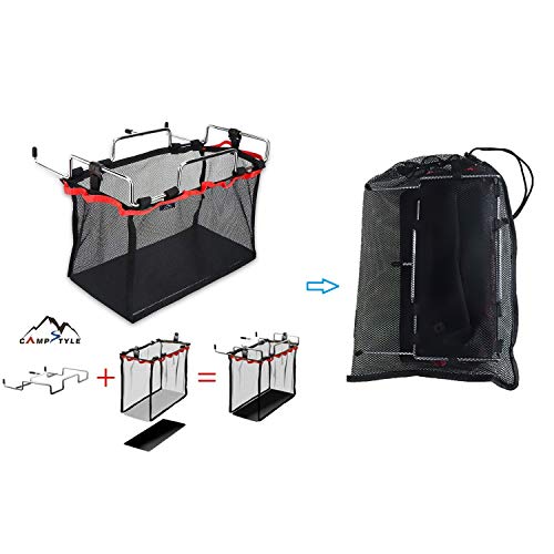 使わないときに場所を取るモノは嫌! という方のための折り畳みバケツです。 蓋の部分がメッシュネットの物入れになっているので、食器をバケツの中のネットに入れてキャンプに行けます。 食器を洗う時にはネットケースごと洗い場に持っていき、ついでにこのバケツも丸洗いできます。