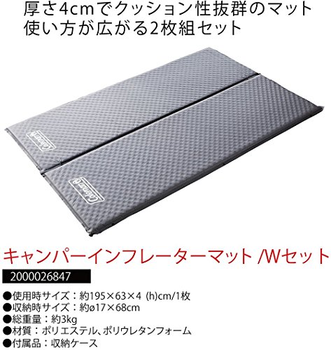 出典: https://www.amazon.co.jp/Coleman-%E3%82%B3%E3%83%BC%E3%83%AB%E3%83%9E%E3%83%B3-%E3%82%AD%E3%83%A3%E3%83%B3%E3%83%91%E3%83%BC%E3%82%A4%E3%83%B3%E3%83%95%E3%83%AC%E3%83%BC%E3%82%BF%E3%83%BC%E3%83%9E%E3%83%83%E3%83%88-W-2000013057/dp/B00B1LDWOI/ref=sr_1_4?ie=UTF8&qid=1514433602&sr=8-4&keywords=%E3%82%A4%E3%83%B3%E3%83%95%E3%83%AC%E3%83%BC%E3%82%BF%E3%83%BC%E3%83%9E%E3%83%83%E3%83%88&refinements=p_89%3AColeman%28%E3%82%B3%E3%83%BC%E3%83%AB%E3%83%9E%E3%83%B3%29こちらのコールマン製のインフレーターマットは、クッション性に優れていて、ダブルサイズのインフレーターマットです。キャンプ用に使えるダブルサイズで、ご家族や友人などと使用する事も可能なサイズです。 スポンジの厚さは4cmでクッション性能がアップしています。頭の部分はスポンジを厚くしてあり、 快適に眠ることができます。持ち運びに便利な収納ケースが付属されており、手軽に手早くテントの中に広々としたベッドスペースが出来ます。冬の時期でも暖かくして眠れますので人気です。