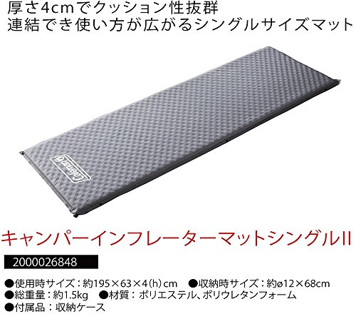 出典: https://www.amazon.co.jp/Coleman-%E3%82%B3%E3%83%BC%E3%83%AB%E3%83%9E%E3%83%B3-2000026848-%E3%83%9E%E3%83%83%E3%83%88-%E3%82%AD%E3%83%A3%E3%83%B3%E3%83%91%E3%83%BC%E3%82%A4%E3%83%B3%E3%83%95%E3%83%AC%E3%83%BC%E3%82%BF%E3%83%BC%E3%83%9E%E3%83%83%E3%83%88%E3%82%B7%E3%83%B3%E3%82%B0%E3%83%AB2/dp/B01ABDVK1I/ref=sr_1_1?ie=UTF8&qid=1514433602&sr=8-1&keywords=%E3%82%A4%E3%83%B3%E3%83%95%E3%83%AC%E3%83%BC%E3%82%BF%E3%83%BC%E3%83%9E%E3%83%83%E3%83%88&refinements=p_89%3AColeman%28%E3%82%B3%E3%83%BC%E3%83%AB%E3%83%9E%E3%83%B3%29こちらのコールマン製のインフレーターマットは厚さ4cmで、クッション性抜群のマットです。寒い冬の時期のキャンプ時や登山時にテントの中に敷いて暖かくして寝ることができます。 連結することができて、使い方が広がるシングルサイズのインフレーターマット。コンパクトに収納ケースに収めることが出来て便利です。