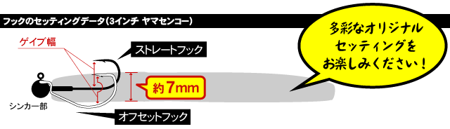 ヤマセンコーに合わせるオフセット選ぶポイントは、フォールアクションを活かしたいならハチマキより小さいサイズで、フッキング重視ならハチマキより少し大きめのサイズがおすすめです。