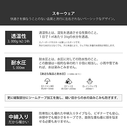 耐水圧と透湿性に優れており、ウェア内のムレや、ウェアの水濡れを防いでくれますので、ストレス無くライディングに集中する事ができ、快適に過ごすことが可能です。まだ一つもスキーウェアを所持していない方におすすめしたいスキーウェアです!