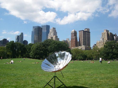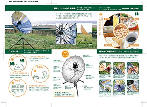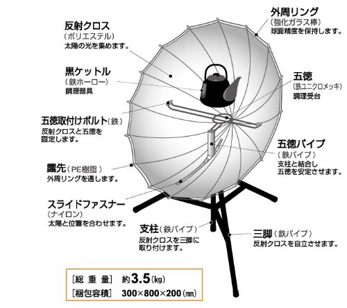 パラボラ傘径が約1メートルという本格的なもの。集光し易いので天気にもよりますが20分で1リットルの水を沸かすことができます。ただ太陽は動きますから、その動きに合わせて傘の向きを変えてあげることも忘れないようにしてください。重さは3.5キロという軽量さで持ち運びが簡単です。価格は3万円台から4万円台
