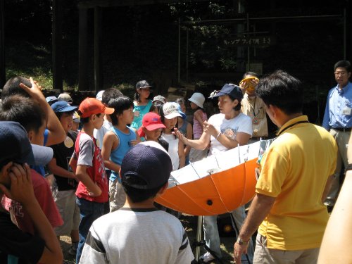 何といってもキャンプのお供に欠かせません。ソーラークッカーで出来上がった料理を前に、ついついみんなが笑顔になります。写真は鍋奉行ならぬソーラークッカー傘奉行のお父さんの出番です。